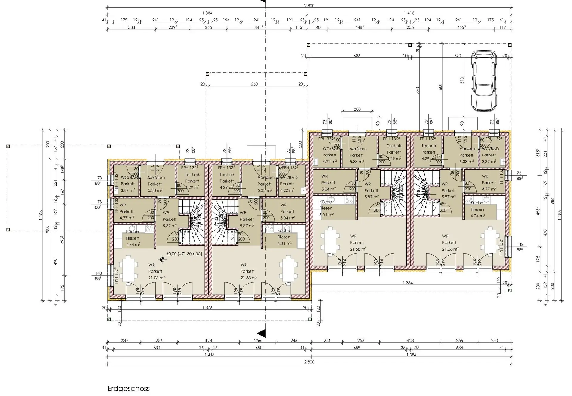 Alle Wohneinheiten beinhalten einen überdachten Balkon (optional mit Belag und Geländer) und eine Terrasse mit einer Größe von 9,8 m². Gegen Aufpreis kann ein weiteres Carport oder eine Garage gekauft werden.